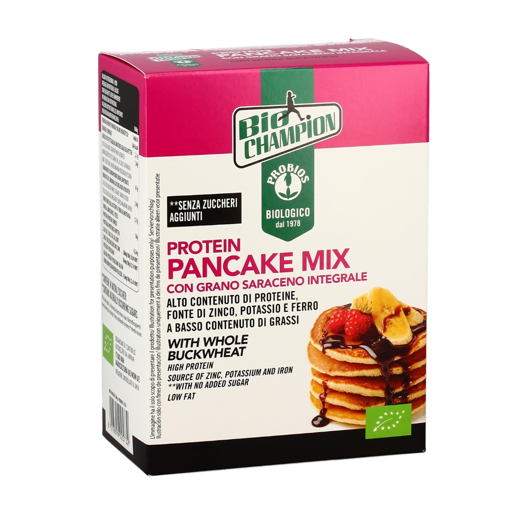 Protein Pancake Mix di Probios ĆØ un preparato per pancake 100% vegan e senza glutine: ad alto contenuto proteico e fonte di fibre, zinco, potassio e ferro.